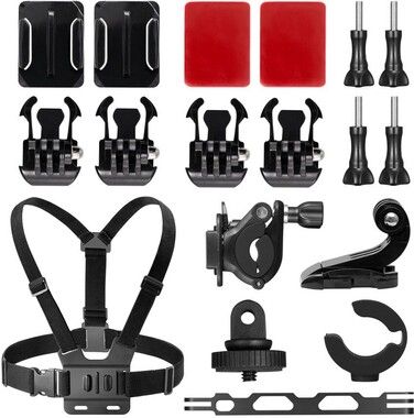 Tilbehørssæt til dit actionkamera for bedre videoer, når du står på ski. Sættet indeholder bl.a. beslag til hjelm og stænger.