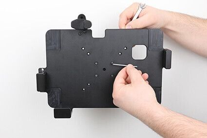 Holdere med låsning bruges, når du vil holde din tablet ekstra solidt på plads. Holderen har en fjederkuglelåsefunktion, den holder din enhed fast i holderen. Du kan for eksempel tilslutte et ladekabel til enheden, når den er i holderen. Holderen er monteret på et kugleled. Det betyder, at du nemt kan justere vinklen for bedre visning og skifte mellem portræt- og landskabstilstand ved at dreje holderen til den ønskede position.