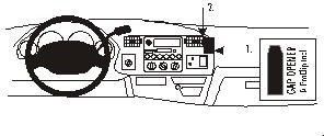 1. Tryk den medfølgende spalteåbner ind i mellemrummet 1 for at udvide afstanden mellem kontrolpanelet og instrumentbrættet. Rengør overfladen ved 1 og 2 med den medfølgende vådtørring. Fjern beskyttelsesplastikken på de to dobbeltsidede klæbebånd på ProClip holderen.
