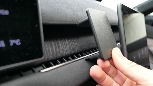 1. Brug den medfølgende vådserviet til at rengøre området, hvor ProClip-beslaget skal monteres. Fjern den beskyttende plast fra den dobbeltsidede tape på beslaget. Krog den rillede øvre del af beslaget over rammen, der omgiver luftgitteret.
