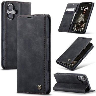 Et stilfuldt pungcover til iPhone 16 Plus, der har 2 kortpladser og en seddellomme. Etuiet har en mat overflade og er lavet af imiteret læder.