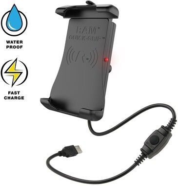 Vandtæt mobilholder med Qi-opladning med fjederbelastet RAM Quick-Grip-design og 15W ladeeffekt. Beslaget er kompatibelt med dobbelte ærmer i størrelse B og kuglebaser til montering på det ønskede sted.