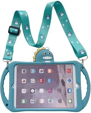 Sødt iPad mini 7/6 cover velegnet til børn (eller dem med et barnesind). Etuiet med en grøn dinosaur er blød silikone, har en flot farve og en justerbar bærerem.