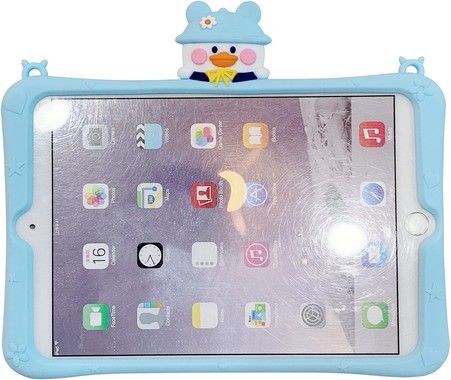 Justerbart silikone etui til iPad Pro 10,5 med en and, blomster, hjerter og stjerner på. Skallen er perfekt til børn og har en fleksibel bærestrop.